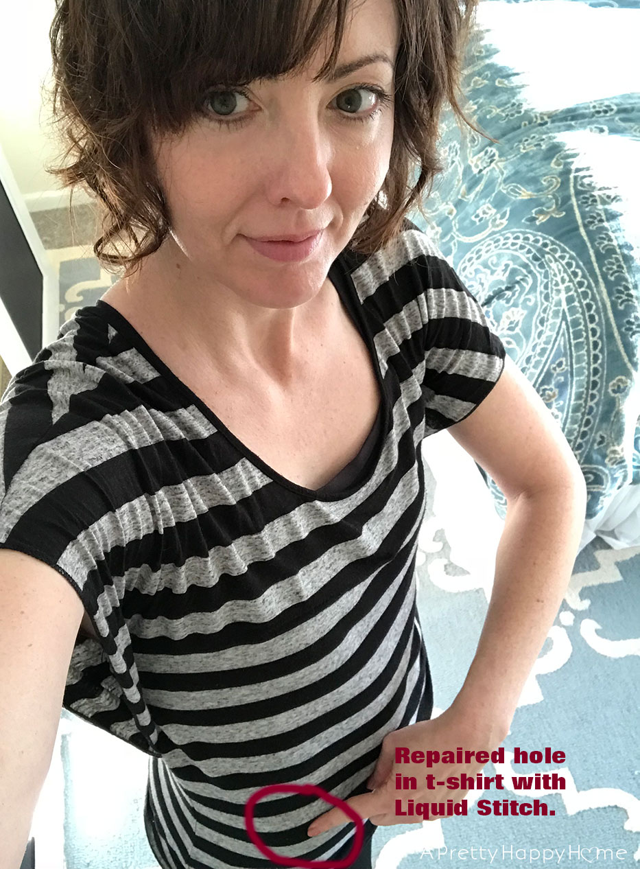 There are plenty of people who have dissed this fix. But! I still have that shirt I repaired for the tutorial years ago and the hole is still fixed. Now, I don’t regularly wear that shirt. It also doesn’t go in the dryer because none of my shirts go in the dryer. Maybe that has helped the fix last longer? I don’t know. I just know the glue has held.