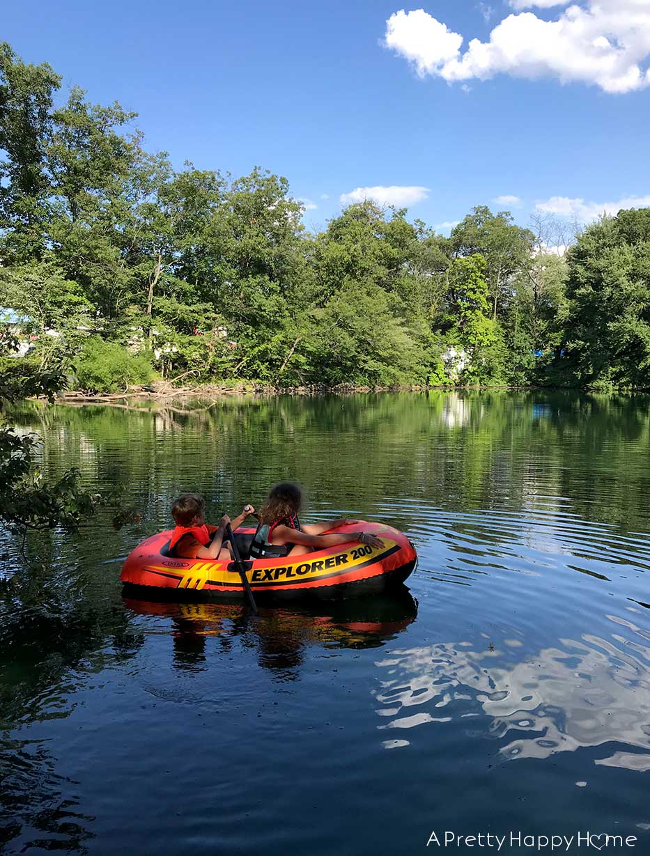 3. The raft came with two oars, but paddling that way required more coordination than my kids have at the moment. Instead, we screwed the paddles together to make one kayak-style paddle. That seems to work better for them.