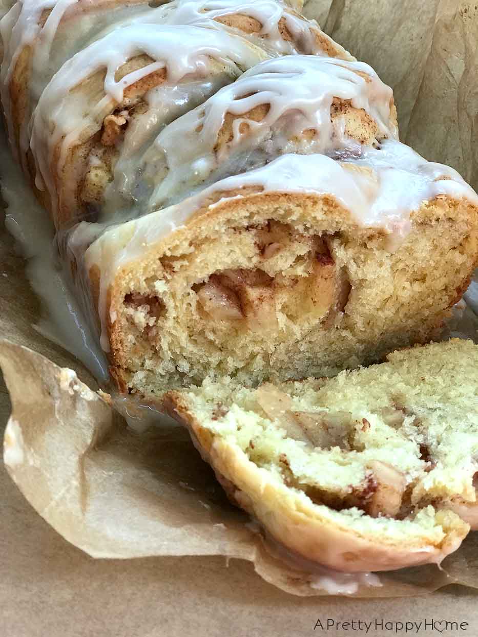 If I was to make the recipe again, I’d mix cinnamon into the dry ingredients of the bread dough. That’s a flavor insurance policy, of sorts, in the event the apples get rolled up on one side of the loaf like mine did. I need more loaf rolling practice!