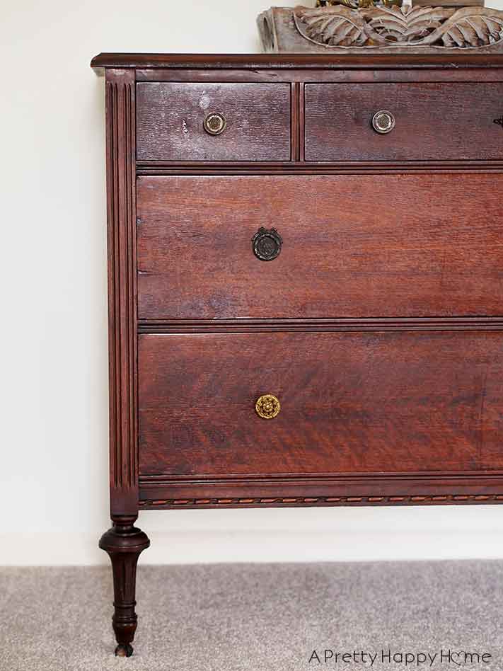 The hardest challenge will probably be to find two replacement drawer pulls. The bottom drawer has different and newer hardware than the rest of the dresser, so I would like to remedy that. I just haven’t taken the time to do an internet search for new pulls.