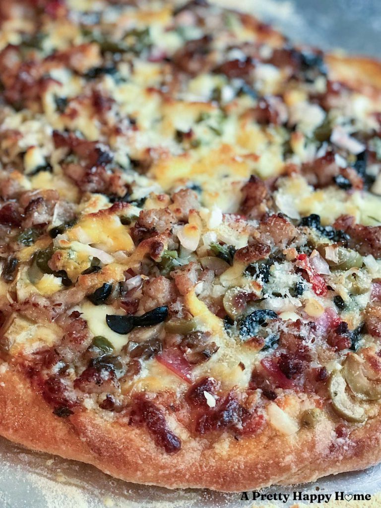 The recipe makes two pizzas. I prep and bake both, but end up freezing one of them to reheat on a night when I don’t feel like cooking.