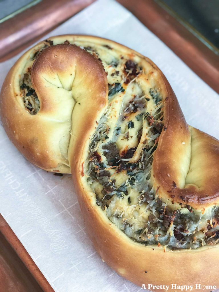If you want a showstopper that tastes even better than it looks, it’s this recipe. It looks hard, but it’s not. It’s the same concept as making cinnamon rolls. Instead of slicing your roll, you shape it into a figure 8.
